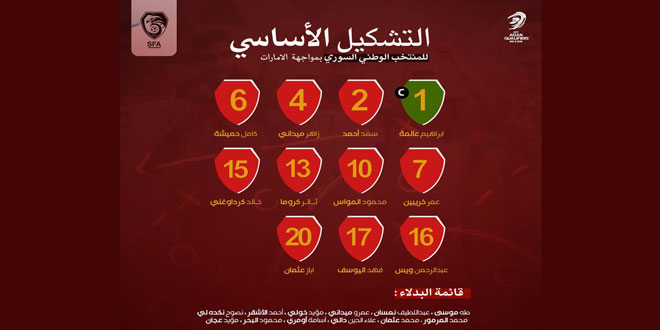 أعلن المدير الفني لمنتخب سورية لكرة القدم نزار محروس تشكيلة منتخبنا في مباراته مع منتخب الإمارات عند الساعة السابعة من مساء اليوم في الأردن ضمن الدور الحاسم لتصفيات كأس العالم في قطر 2022.