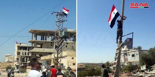 رفع عناصر الجيش العربي السوري اليوم العلم الوطني في حي طريق السد بدرعا.