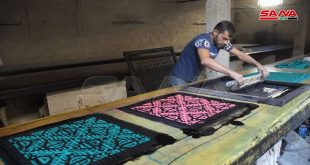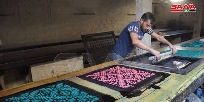 حلب-سانا ضمن ورشة بسيطة في حي الصالحين بحلب وبأدوات يدوية يقوم الحرفي حسن محسن بطباعة …