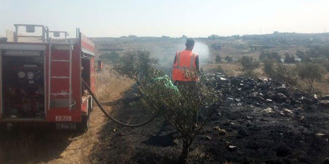 أخمد عناصر الدفاع المدني اليوم حريقاً اندلع بأعشاب يابسة وأشجار مثمرة بأراضي قرية السنديانة بريف حمص الغربي.