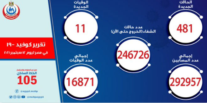 أعلنت وزارة الصحة المصرية تسجيل 11 حالة وفاة و481 إصابة جديدة بفيروس كورونا خلال الساعات الـ 24 الأخيرة.