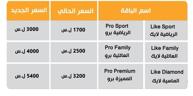 وحسب التعديل الذي أصدرته الشركة وتلقت سانا نسخة منه اليوم أصبح سعر الباقات الرياضية لايك وبرو 3000 ليرة سورية بدلاً من 1700 ليرة والعائلية لايك وبرو 4000 ليرة بدلاً من 2500 ليرة والماسية لايك والمميزة برو 5400 ليرة بدلاً من 3200 ليرة.