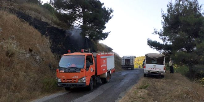 وكانت فرق إطفاء حمص أخمدت منذ يومين حريقاً طال أعشاباً يابسة وأشجاراً حراجية على طريق قريتي شين والصويري بريف حمص الغربي.