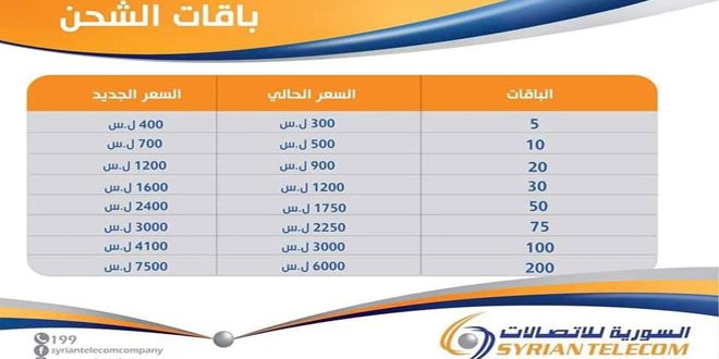 وبين المدير العام التنفيذي للشركة السورية للاتصالات المهندس سيف الدين الحسن في تصريح لمندوبة سانا أن التعديل الجديد شمل خدمة إنترنت تراسل (اي دي اس ال) وباقات الشحن وخدمات الهاتف الثابت وخدمة فايبرنت “منزلي وأعمال” وجاء وفق نسبة تؤمن تغطية التكاليف التشغيلية بالحدود الدنيا مشيراً إلى أنه تمت زيادة الأسعار بنسبة وسطية تقدر بنحو 40 بالمئة مع مراعاة الشرائح الأقل دخلاً التي تستفيد من خدمة الانترنت بسرعات محدودة 512 كيلوبات و1 ميغا و2 ميغا.