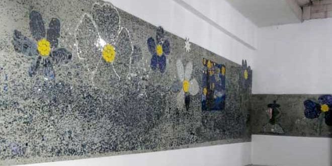 بعزيمة وقوة لا تلين حول فريق (شباب) التطوعي بحمص على مدار شهر ونصف الشهر جزءاً من ركام مدينة المعارض إلى لوحة جدارية فسيفسائية ضخمة تتموضع على مدخل المدينة بحي الوعر.