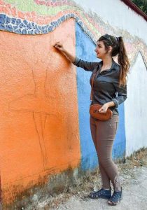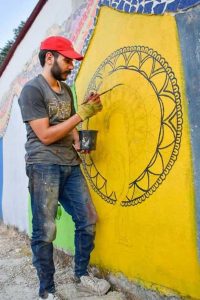 محمد معلا طالب بكلية الهندسة المعمارية في جامعة البعث زين برسوماته جدران الحديقة بـ 12 لوحة فنية عكست مواضيع انسانية حيث أشار إلى استخدامه قطع السيراميك الملون ومواد من توالف البيئة لتصميم جدارية تمتد على كامل مساحة الحديقة تتضمن رسومات توضح حقوق الطفل.