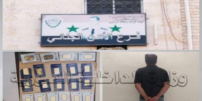 أعلنت وزارة الداخلية أن فرع الأمن الجنائي بطرطوس ألقى القبض على شخص كان بحوزته 20 أونصة ذهبية مزيفة ويحاول بيعها لأحد محلات المجوهرات في طرطوس.