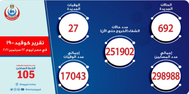 أعلنت وزارة الصحة المصرية تسجيل 27 حالة وفاة و692 إصابة جديدة بفيروس كورونا خلال الساعات الـ 24 الماضية.