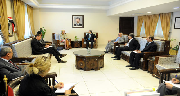 بحث الدكتور فيصل المقداد نائب وزير الخارجية والمغتربين رئيس اللجنة الوطنية السورية لتنفيذ اتفاقية حظر الأسلحة الكيميائية صباح اليوم مع سيغريد كاغ رئيس البعثة المشتركة لمنظمة حظر الأسلحة الكيميائية والأمم المتحدة والوفد المرافق لها الإنجازات الكبيرة التي تحققت على صعيد تنفيذ سورية لالتزاماتها بموجب انضمامها لاتفاقية حظر الأسلحة الكيميائية بما في ذلك الانتهاء من عملية نقل المواد الكيميائية إلى خارج أراضي الجمهورية العربية السورية على الرغم من الظروف الأمنية الصعبة التي تمر بها الآن.