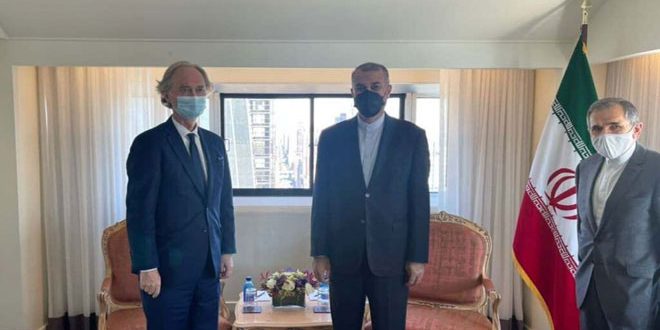 وخلال لقائه المبعوث الخاص للأمين العام للأمم المتحدة إلى سورية غير بيدرسون في نيويورك على هامش اجتماعات الجمعية العامة للأمم المتحدة ندد عبد اللهيان بالإجراءات القسرية أحادية الجانب المفروضة على سورية داعياً المنظمة الدولية إلى القيام بدور أكثر فاعلية لرفعها ومعرباً عن دعمه لجهود الأمم المتحدة لإيجاد حل سياسي للأزمة في سورية.