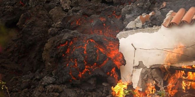 تدفقت آلاف الأطنان من الحمم من بركان كومبري فييخا في جزيرة لا بالما الإسبانية منذ بدء ثورانه السبت الماضي، مدمرة مئات المنازل ومجبرة قرابة 6 آلاف شخص على النزوح.