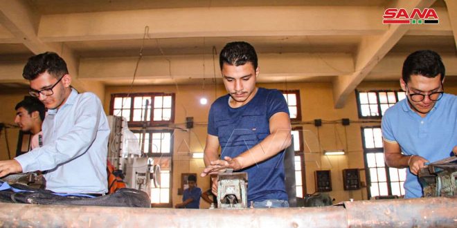 وفي الثانوية الصناعية الخامسة أوضح ناصر محمد مدير الثانوية أن عدد الطلاب بلغ 876 طالباً موزعين على 7 اختصاصات وهي تقنيات الحاسوب والالكترون والكهرباء واللحام والتشكيل والتكييف والتبريد وميكانيك السيارات والتصنيع الميكانيكي مؤكداً أن التعليم المهني يهدف إلى تطوير القدرات العلمية للطلاب من خلال تدريبهم على الآلات في المخابر العملية ليسهموا في إعادة الألق للصناعة السورية.