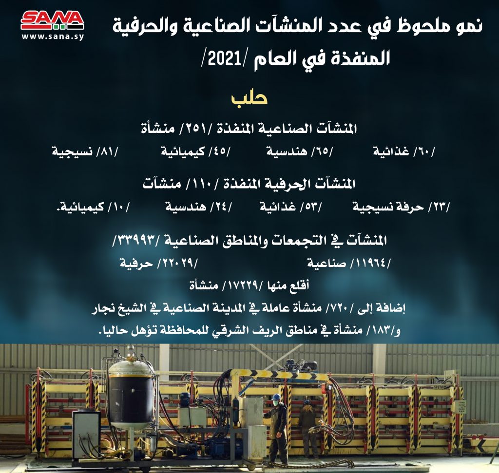 وحسب بيان للوزارة تلقت سانا نسخة منه بلغ عدد المنشآت المنفذة مؤخراً في حلب 251 منشأة صناعية توزعت بين 60 منشأة غذائية و 65 هندسية و 45 كيميائية و 81 نسيجية إلى جانب تنفيذ 110 حرف صناعية توزعت بين 23 حرفة نسيجية و 53 غذائية و 24 هندسية و 10 حرف كيميائية.