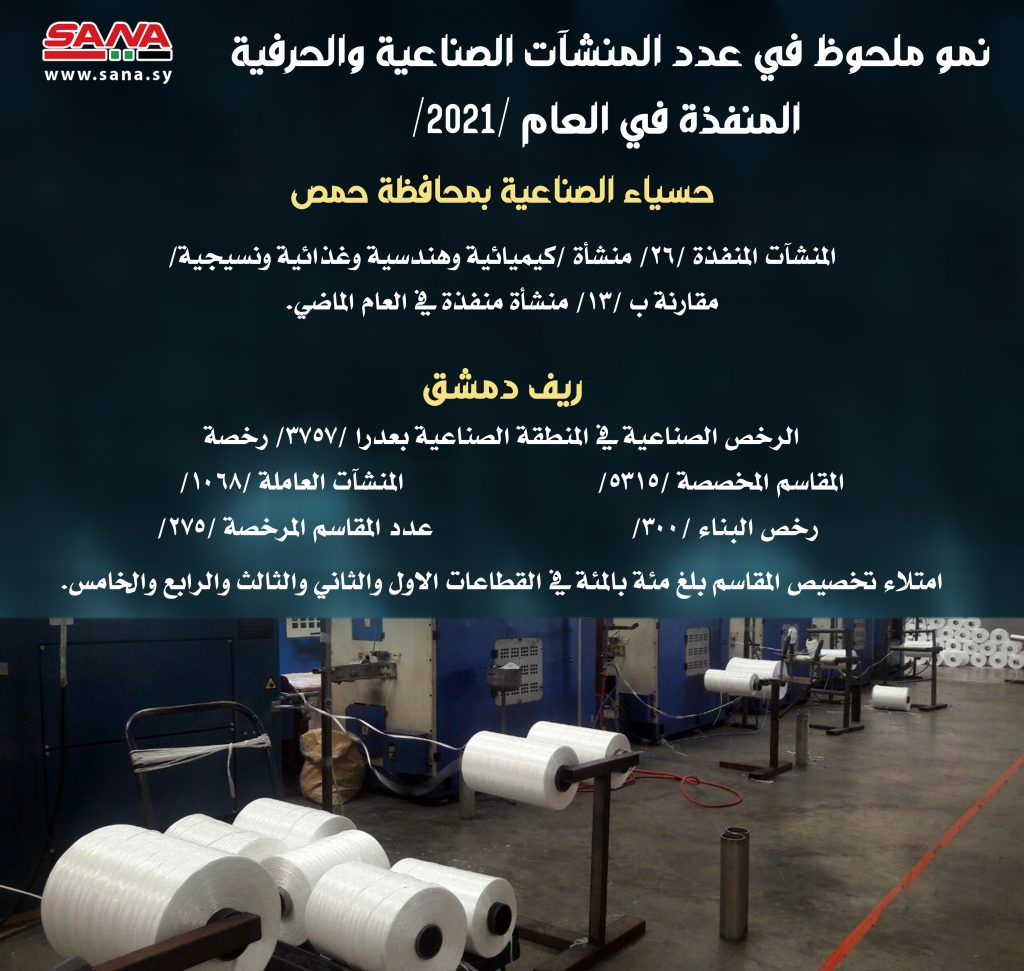 وفي مدينة حسياء الصناعية بمحافظة حمص وصل عدد المنشآت التي نفذت خلال العام الجاري إلى 26 منشأة “كيميائية وهندسية وغذائية ونسيجية” مقارنة بـ 13 منشأة منفذة في العام الماضي.
