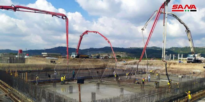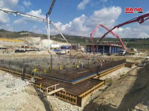 بدأت اليوم أعمال صب أكبر قاعدة في مشروع محطة توليد الرستين الكهربائية بريف محافظة اللاذقية الشمالي وهي قاعدة خزان مياه الخام.