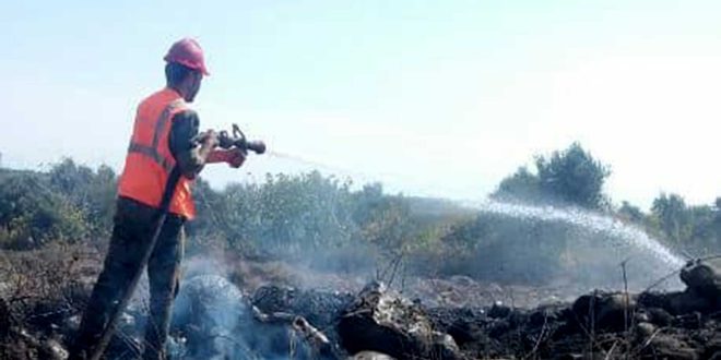 أخمد عناصر الدفاع المدني بحمص اليوم حريقاً اندلع بمساحات من الأشجار المثمرة في الأراضي الزراعية لقرية الصويري بريف المحافظة الغربي.