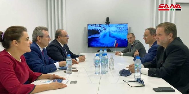 بحث وزير الاقتصاد والتجارة الخارجية الدكتور محمد سامر الخليل مع ألكسي غروزديف نائب وزير الصناعة والتجارة الروسي في دبي اليوم أوجه التعاون بين البلدين في المجالات الاقتصادية.