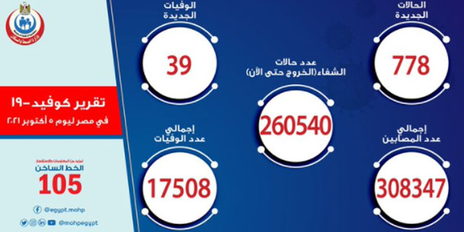 سجلت وزارة الصحة والسكان المصرية 39 حالة وفاة و778 إصابة جديدة بفيروس كورونا خلال الساعات الأربع والعشرين الماضية.
