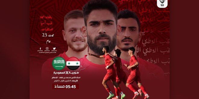 يلتقي منتخب سورية الأولمبي مع نظيره السعودي اليوم من مباريات الجولة الثانية لحساب المجموعة الثالثة من بطولة اتحاد غرب آسيا للمنتخبات المقامة في مدينة الدمام السعودية.
