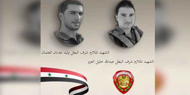 وقالت وزارة الداخلية في بيان تلقت سانا نسخة منه إن الملازم شرف البطل وليد عدنان العثمان والملازم شرف البطل عبد الله خليل العزو من مرتبات منطقة إزرع بدرعا استشهدا بعد استهدافهما بعدة طلقات نارية بالرأس من قبل مسلحين مجهولين على أوتستراد درعا بالقرب من مجمع غزالي وذلك بعد انتهاء دوامهما.