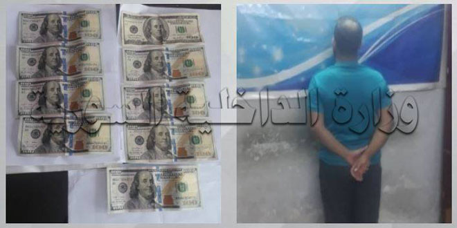 أعلنت وزارة الداخلية أن فرع الأمن الجنائي باللاذقية ألقى القبض على شخص يقوم بترويج عملة أجنبية مزيفة.