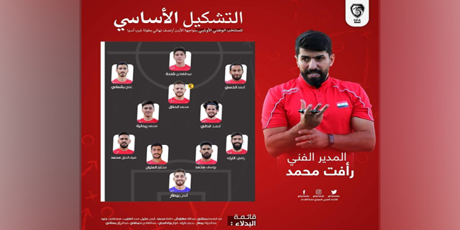 أعلن مدرب منتخب سورية الأولمبي لكرة القدم رأفت محمد تشكيلة منتخبنا للقاء منتخب الأردن في الدور نصف النهائي من بطولة اتحاد غرب آسيا المقامة في السعودية.