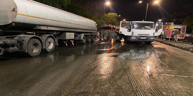 وأكد الخطيب أن دوريات من فرع مرور دمشق توجهت مباشرة إلى المكان وأغلقت الطرق المؤدية إليه فيما تم استدعاء فرق الإطفاء والدفاع المدني وكوادر محافظة دمشق واتخاذ جميع الإجراءات والتدابير الاحترازية حيث تتم إزالة آثار البقع المتسربة عن الطريق.