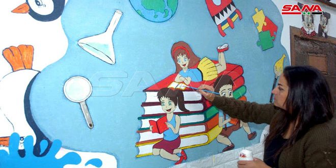 تعكس مؤمنة بكري من مدينة شهبا بالسويداء ما يجول في عوالمها الداخلية تناغماً مع موهبتها الفنية ضمن تجربة واعدة لرسم لوحات فنية على الجدران أطلقتها خلال العام الحالي من إحدى رياض الأطفال.