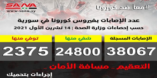 وأوضحت الوزارة في بيان تلقت سانا نسخة منه أن عدد الإصابات المسجلة في سورية بلغ حتى الآن 38067 شفيت منها 24800 حالة وتوفيت 2375 حالة.