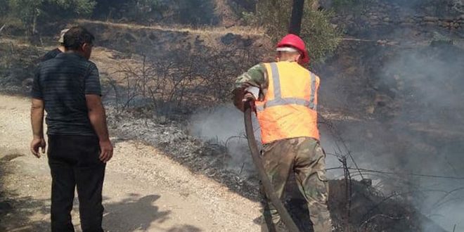 أخمد عناصر الدفاع المدني بحمص اليوم حريقا اندلع بمساحات من أشجار الزيتون والأعشاب اليابسة بالأراضي الزراعية لقرية المتعارض في ريف المحافظة الغربي.