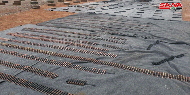 وذكر مصدر في الجهات المختصة لمراسل سانا أن “الأسلحة شملت ألغاماً مضادة للدبابات وعبوات ناسفة وقذائف (ار بي جي) ورشاش (بي كي سي) ومناظير حربية وأجهزة تفجير عن بعد وبنادق روسية وكميات كبيرة من الطلقات من عيارات متنوعة”.
