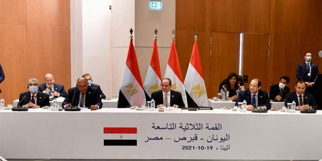 أكد الرئيس المصري عبد الفتاح السيسي اتساق مواقف كل من مصر واليونان وقبرص حول ضرورة التمسك بوحدة الأراضي السورية وسلامتها الإقليمية وأهمية مواجهة خطر التنظيمات الإرهابية وضرورة التصدي لها ورفض محاولات بعض الأطراف الإقليمية انتهاك السيادة السورية.