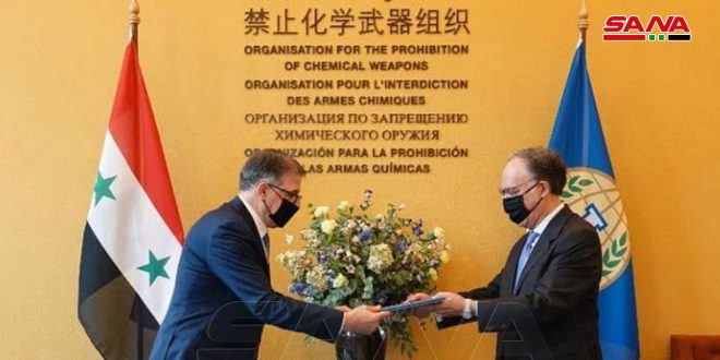 قدم المندوب الدائم للجمهورية العربية السورية لدى منظمة حظر الأسلحة الكيميائية السفير ميلاد عطية اليوم أوراق اعتماده إلى المدير العام للمنظمة فرناندو آرياس في لاهاي.