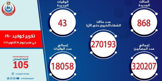 سجلت وزارة الصحة والسكان المصرية 43 حالة وفاة و 868 إصابة جديدة بفيروس كورونا المستجد خلال الساعات الأربع والعشرين الماضية.