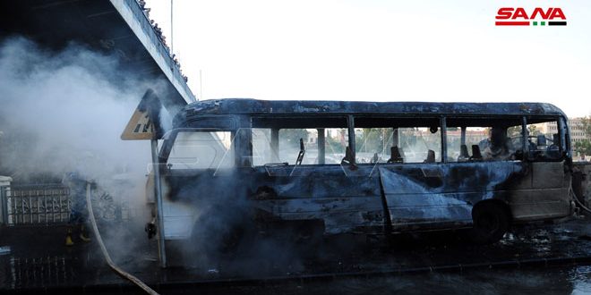وارتقى 14 شهيداً ووقع عدد من الجرحى جراء تفجير إرهابي بعبوتين ناسفتين تم لصقهما بحافلة مبيت عسكري عند جسر الرئيس بدمشق في وقت سابق صباح اليوم.