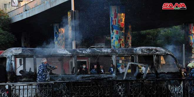 وارتقى أمس 14 شهيداً ووقع عدد من الجرحى من جراء تفجير إرهابي بعبوتين ناسفتين استهدف حافلة مبيت عسكري لدى مرورها بالقرب من جسر الرئيس بدمشق.