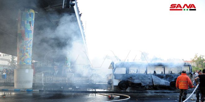 وارتقى أمس 14 شهيدا ووقع عدد من الجرحى من جراء تفجير إرهابي بعبوتين ناسفتين استهدف حافلة مبيت عسكري لدى مرورها بالقرب من جسر الرئيس بدمشق.