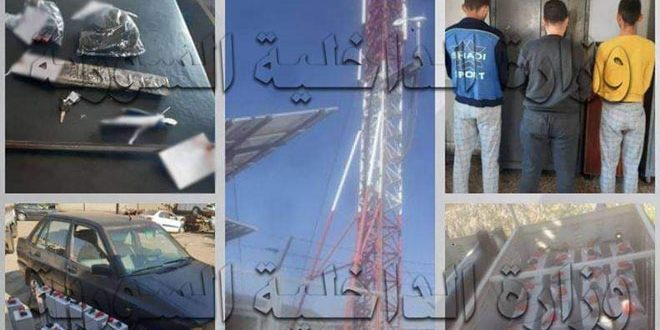 وأوضحت وزارة الداخلية في بيان تلقت سانا نسخة منه أنه بناء على المعلومات الواردة لشرطة ناحية سلحب في حماة حول تعرض أحد أبراج شبكة الخليوي (سيريتل) في بلدة أبو قبيس للسرقة من قبل أشخاص مجهولين ومن خلال البحث والتحري الدقيق تمكنت شرطة الناحية من القبض على السارق وحجز سيارة نوع سابا كان يقودها وبتدقيق وضع السيارة تبين أنها مسروقة وتحمل لوحات غير مطابقة ومذاع البحث عنها.
