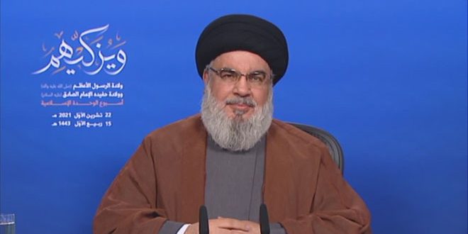 ودعا السيد نصر الله في كلمة له بمناسبة ذكرى المولد النبوي الشريف إلى تحمل المسؤولية تجاه فلسطين لافتاً إلى أنه “لا يستطيع أي إنسان حر أن يقول أنه غير معني بقضية فلسطين .. هذه أرض محتلة وشعب مظلوم ومقدسات منتهكة وهناك عدو يشكل تهديداً للأمة”.