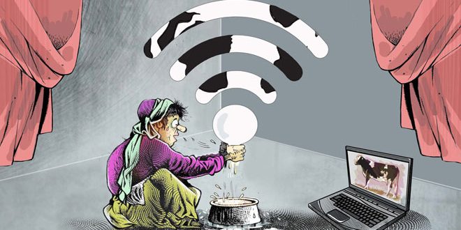وصورت لوحة الفنان خليل الفائزة بمفارقة شديدة الدلالة واقع التعامل مع مواقع التواصل واستخدام رموزها في استثمار الوقت والعمل.