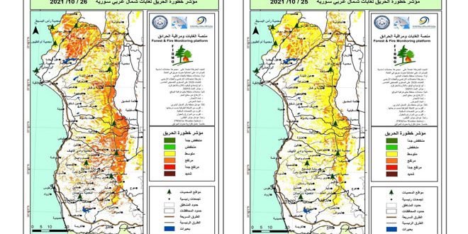 رئيس المنصة في الهيئة الدكتورة روزة قرموقة أوضحت في تصريح لـ سانا أن مؤشرات خطورة الحريق تستمر بالتراجع اليوم الاثنين مقارنة لما كانت عليه يوم أمس الأحد حيث تؤثر مؤشرات الخطورة المتوسطة على أغلب مواقع الغابات في شمال غرب سورية لتعود وترتفع بشكل واضح يوم غد الثلاثاء حيث تزداد مساحة الغابات المتأثرة بمؤشرات الخطورة المرتفعة.