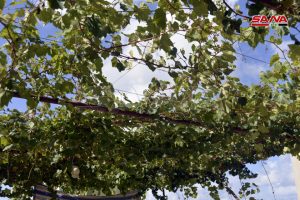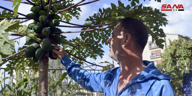 استثمر رجل حديقة منزله في سكن الشباب باللاذقية لتكون مصدراً لسد احتياجاته الغذائية الأساسية ومساحة لملء وقت الفراغ فقام بزراعتها بعدد من أنواع الفواكه والخضار.