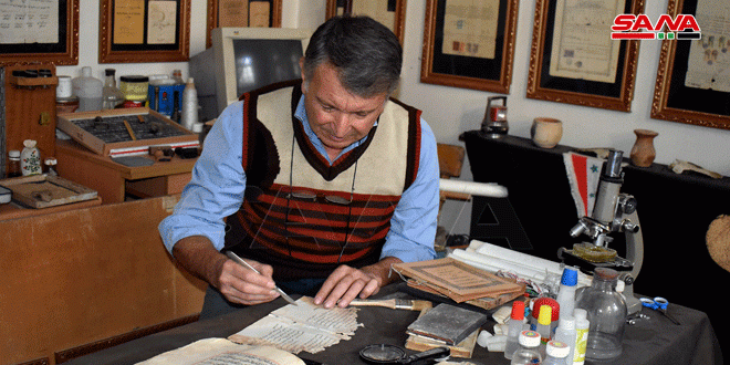 بدقة وصبر يقوم الدكتور محمد خواتمي بترميم المخطوطات والكتب القديمة في ورشته الصغيرة التي أنشأها في حي باب النصر بحلب القديمة بهدف الحفاظ على التراث الثقافي السوري.