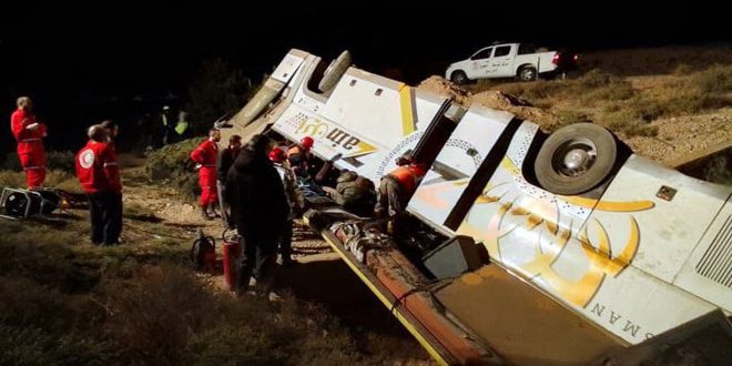 توفي شخص وأصيب عدد آخر فجر اليوم جراء تدهور حافلة ركاب على الطريق الدولي حمص دمشق في موقع البريج جنوب حمص.