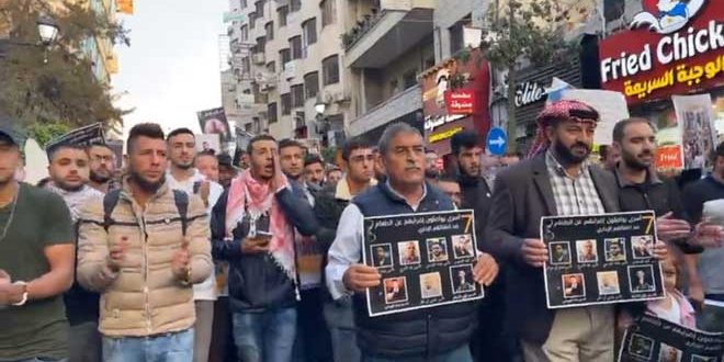 طالب عشرات الفلسطينيين خلال وقفة تضامنية في رام الله بالضفة الغربية اليوم المجتمع الدولي والمؤسسات الحقوقية والإنسانية والصليب الأحمر الدولي بالتدخل العاجل لإنقاذ حياة الأسرى في معتقلات الاحتلال الإسرائيلي وخاصة المرضى والمضربين عن الطعام منهم.