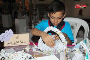 وتضمنت الورشة أعمالاً فنية للأطفال في اختصاصات الرسم والخط العربي والتصميم الإعلاني والكاريكاتير وصنع بطاقات المعايدة والتهنئة والورود الورقية والتي قدمها الأطفال على شكل هدايا رمزية لأرواح الشهداء وأبطال الجيش العربي السوري.