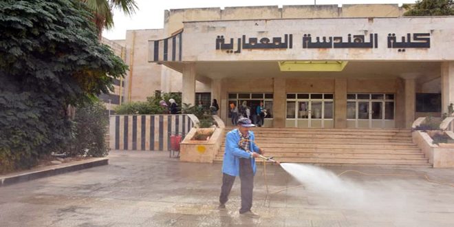 نفذت جامعة البعث اليوم حملة تعقيم لمباني الكليات والمعاهد وجميع المرافق والساحات فيها وذلك ضمن الإجراءات الاحترازية للوقاية من فيروس كورونا.
