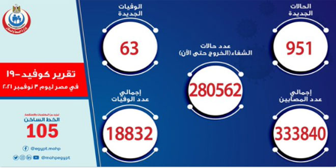 سجلت وزارة الصحة والسكان المصرية 63 حالة وفاة و951 إصابة جديدة بفيروس كورونا خلال الساعات الأربع والعشرين الماضية.