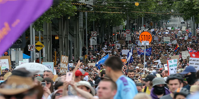 خرجت مظاهرات حاشدة في أنحاء أستراليا اليوم احتجاجاً على التطعيم الإلزامي الذي فرضته الحكومة لمواجهة فيروس كورونا المستجد.