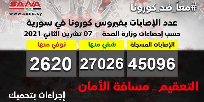 وقالت الوزارة في بيان تلقت سانا نسخة منه إن عدد الإصابات المسجلة في سورية بلغ حتى الآن 45096 شفيت منها 27026 وتوفيت 2620 حالة.